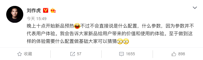 刘作虎此前曾坦言不会谈到具体配置和参数,因为参数无法代表用户体验。刘作虎给网友们留了一个悬念:“我会告诉大家新品给用户带来的价值和使用体验。至于做到这样的体验需要什么配置做基础大家可以猜猜。”不少用户大呼不够过瘾,希望刘作虎能曝更多的“猛料”,更希望一加的新品能够早日发布,尽早体验到刘作虎在微博上说的“轻快流畅(Fast & Smooth)”。
