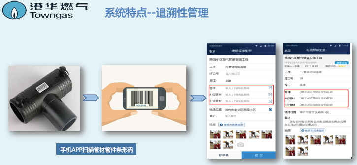 除此之外,工程管理移动应用具备追溯性管理的特点。每一个管件上面都有一个追溯码,用手机APP扫描管材管件条形码,管件的信息就可以进到系统。这样一来,日后在运维过程中哪个管件有问题,可以方便管理。