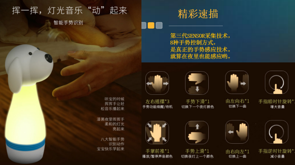 Hibou这款产品采用第三代SENSOR采集技术,支持8种手势控制方式,方便孕妇在夜里能以更随意的方式开启灯光,不再需要寻找特定的开关。