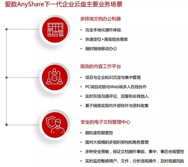 爱数的AnyShare产品作为中国企业云盘的领导者,充分结合Gartner对云盘市场的专业分析和预测,率先打造了“下一代企业云盘”的概念。相比传统云盘,下一代企业云盘不再是单一的文件同步备份、多终端访问、共享协作的工具,而是一个面向多终端、多应用的内容协作平台,实现了从系统构架、存储访问方式、管理级别、安全体系和产品开放性五个角度的全面升级。从实现内容管理现代化的角度来看,AnyShare下一代企业云盘能够为企业级客户提供更好的共享协作体验,业务相关内容、环境相关性内容、移动和内容互动相关的体验;从数据基础设施现代化的角度出发,AnyShare下一代企业云盘面向非结构化数据的云存储,覆盖数据全生命周期管理,包括数据的统一存储、安全、管理合规性、数据治理及运营优化、可管理能力等等。