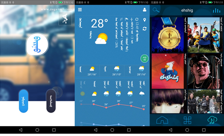 点开这款蒙古文智能手机,无论是手机壁纸、功能应用,还是聊天工具等服务性软件功能齐全、操作方便,吸引了众人的目光。其中包含了我们平常生活中沟通、娱乐、学习等各种应用,如:聊天工具Bainu、天气预报工具、音乐播放器ehshig、新闻类的腾格里客户端和蒙古语电视等。