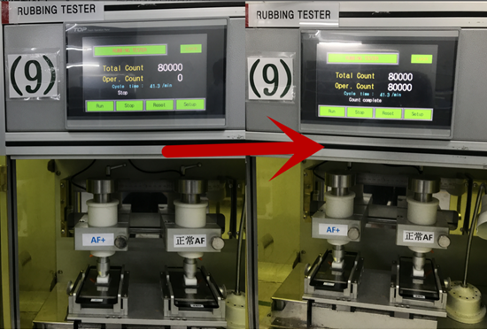这一使用寿命的数据是来源于专业实验室的钢丝绒摩擦测试(测试条件:1kg载荷,2×2cm摩擦面积),通过大量、反复的钢丝绒摩擦测试,来对比普通AF镀膜与信利AF+技术的实际性能差距。