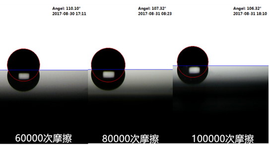 而信利AF+镀膜在3万次摩擦之后的水滴保持了111°水滴接触角,说明镀膜层磨损极为微小,完全不影响疏油层的使用。基于这个镀膜的健康状态,之后又连续多批次的测试了6万次、8万次以及10万次的极限测试,结果显示信利AF+技术在6万次摩擦是最稳定的,没有一次水滴接触角是小于100°,说明信利AF+技术至少可以坚持6万次以上的摩擦,6万次仅是一个基础。而在极限测试下,多次也能维持8~10万次的摩擦疏油镀膜不失效,通过技术工艺的持续改良,相信还会有更佳的性能提升空间。