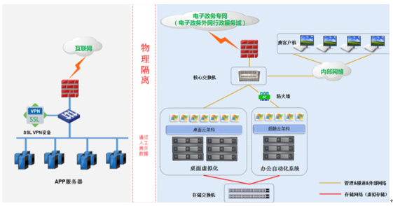 本次桌面云应用于电子政务外网行政服务域办公,在电子政务外网仍然采用PC机,PC机和深信服云终端采用KVM切换器,实现共用一套鼠标键盘显示器,大大节省了空间。
