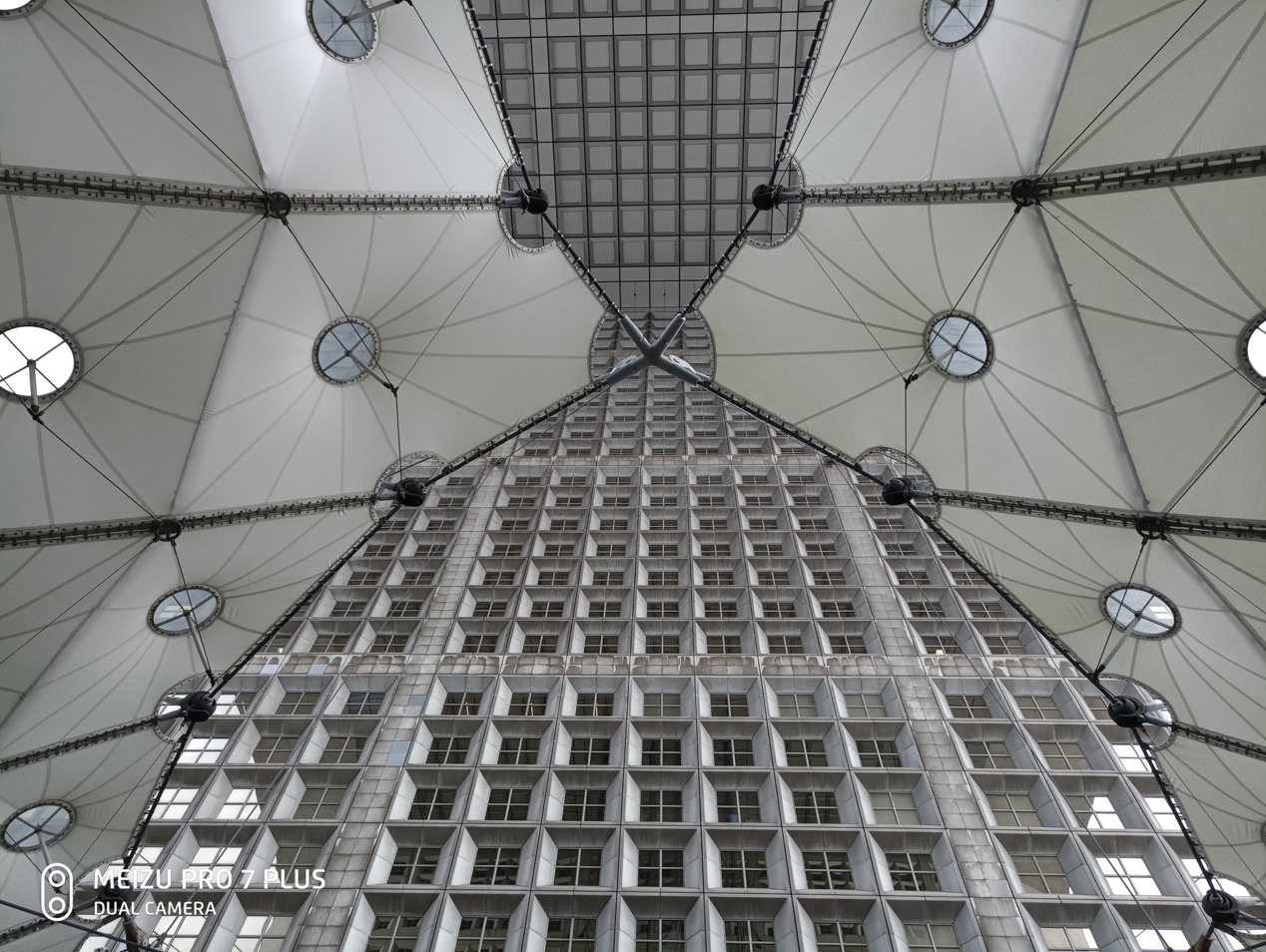 就可以找到众多线条的交汇处,不同规模与形状的众多直线、曲线汇聚于此,使得它天生具有引人注目的能力,而这时拿出魅族PRO7,按下快门键,一张极具艺术魅力的照片就出来了,而通过单反拍摄,你需要换上广角镜头然后再举起沉重的器材进行拍摄,是不是很浪费这不经意的抬头所发现的美好?