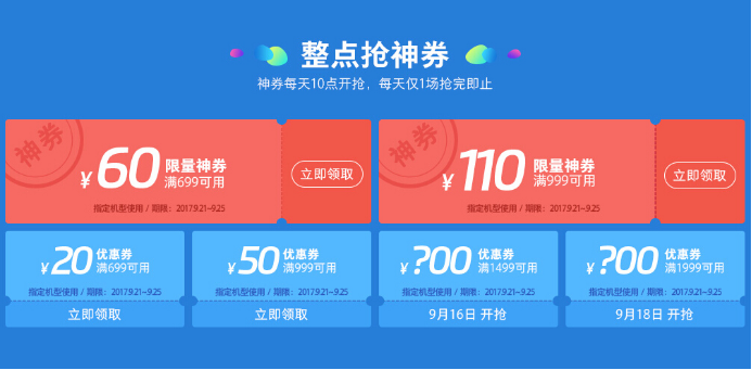 根据魅友节的官方活动介绍,从9月12日开始一直到20日23:59:59,魅族官网每天10点都会放出一大波购机优惠券,其中满699元-60元券和满999元-110元两张神券最为抢手,满699元-20元和满999元-50元则基本上可以随时领到。另外在9月16日和9月18日两天,还会放出满1499元立减和满999元立减两种神秘优惠券。