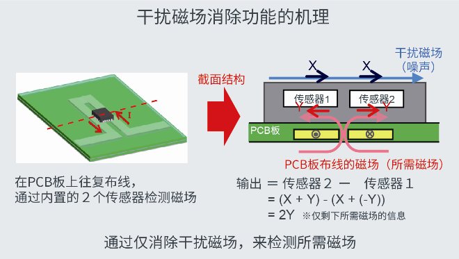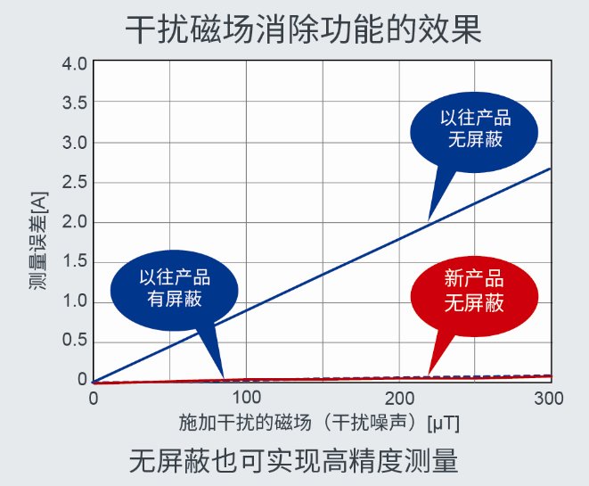以往产品会因受地磁等干扰磁场的影响而产生测量误差,需要采用磁屏蔽措施来屏蔽干扰。而ROHM的新产品,安装在PCB板的往复布线上,利用内部的双感应单元即可消除产生噪声的干扰磁场,仅会检测到原本需要测量的电流产生的磁场,因此无需屏蔽即可实现高精度测量。