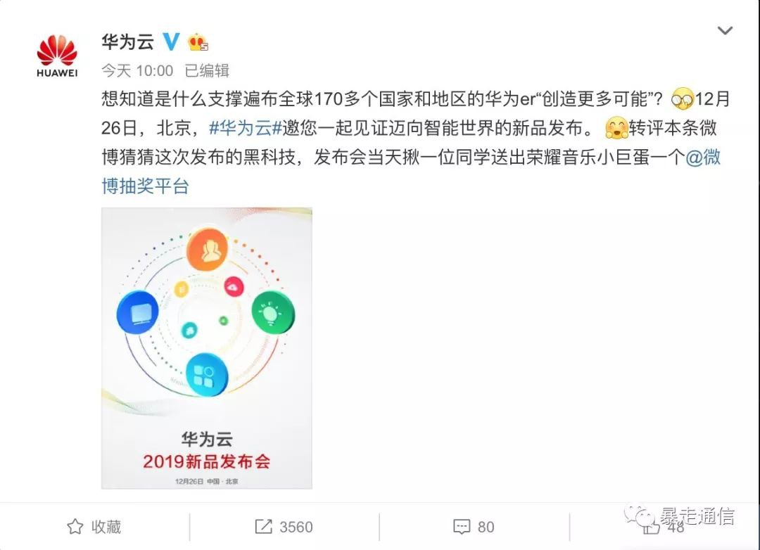 昨日华为云官方微博发布消息将在12月26日再举行一次新品发布会,暴走通信斗胆猜测主角很可能是近期传言的在华为内部大名鼎鼎的WeLink。之所以做出这样的猜测,是因为在华为云官方微博刚刚放出的海报上,几种常见的智能办公的标志被放在了核心位置。此前,华为云主要对外提供计算、存储、AI开发平台等云服务,并没有协作办公类的产品。联想到阿里钉钉在年初被划进了阿里云智能,莫非华为也将其内部协作平台WeLink划进了华为云?