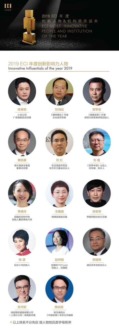 据介绍,“ECI中国年度商业创新影响力人物”表彰的是利用自己的个人影响力、专业力在所处行业乃至社会范围内,产生积极影响以及推动力的人物。他们的专业见解成为行业内纷纷效仿之目标、意见之领袖。