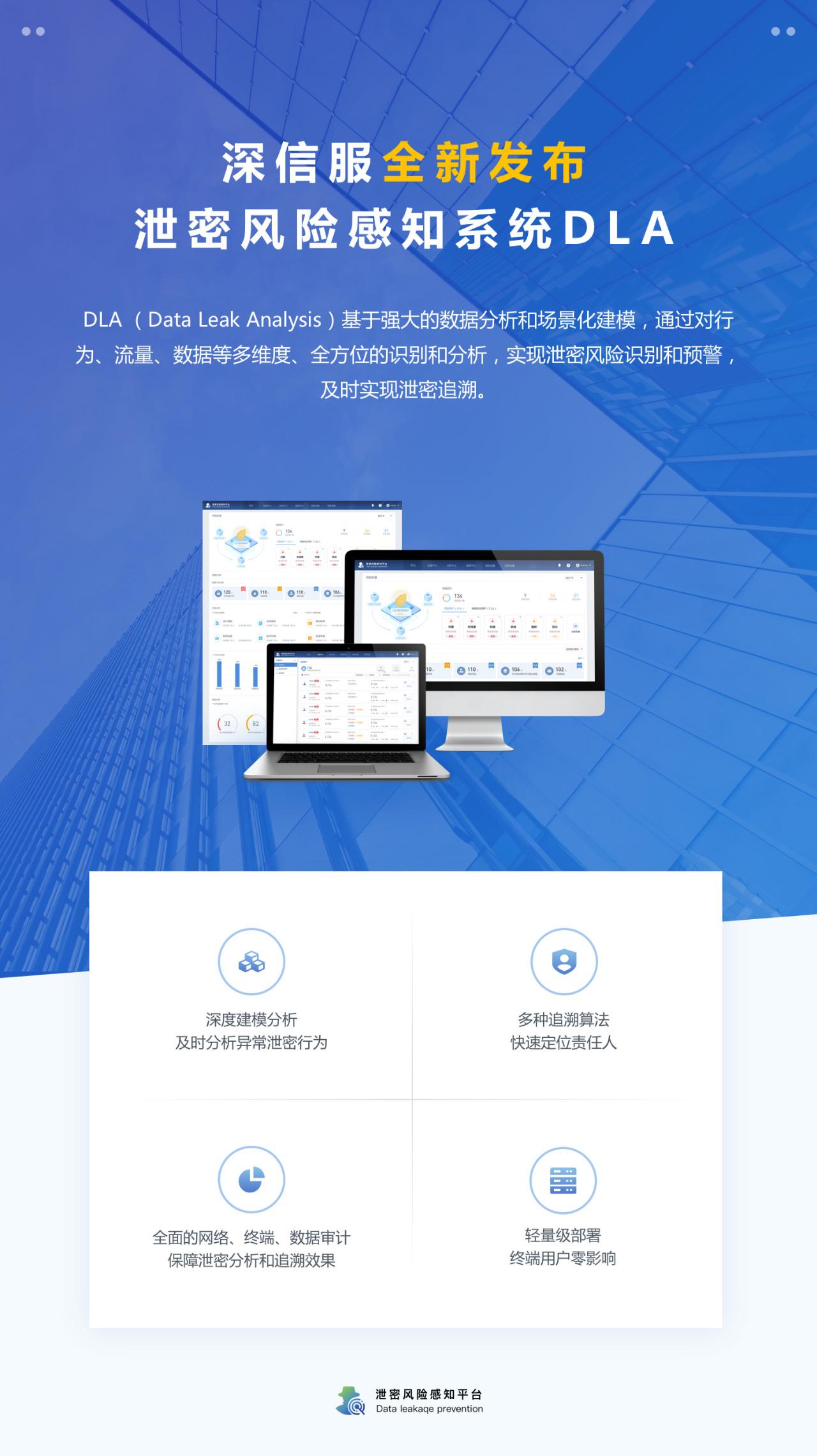 为此,基于深信服上网行为管理全面的网络审计、终端审计、文件审计能力,深信服重磅推出泄密风险感知系统(DLA),它使用机器学习、智能算法、强大的规则和UEBA分析,以及场景化建模,通过对行为、流量、数据等多维度、全方位的识别和分析,有效实现泄密风险识别和预警,以及及时的泄密追溯。