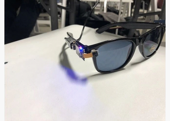 这是一个帮助盲人的智能设备,它相当于一个可拍照的智能眼镜。