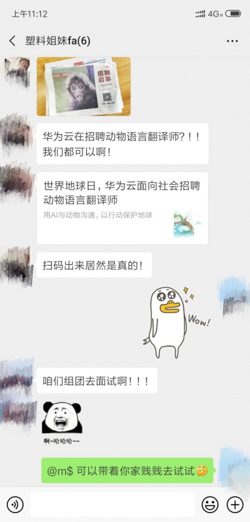 不过,华为云招聘动物语言翻译师究竟要做什么?联想到4月16日的2019华为分析师大会上,有人晒出一张背景板,华为云播放了一段视频,讲述华为云运用人工智能、云和手机保护哥斯达黎加热带雨林中的蜘蛛猴等珍稀动物。莫非是参与保护动物的项目?