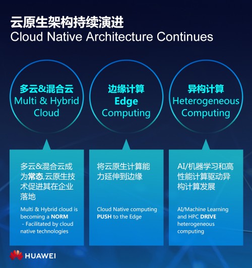 华为云通过持续参与到技术社区、深入到商业客户群,并与生态伙伴在云原生领域进行合作与探讨,提出云原生技术与商业结合的三大发展趋势: