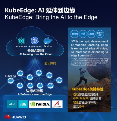 在边缘计算领域,KubeEdge将AI延伸到边缘,形成泛在智能边缘网络。据IDC研究显示,到2020年将产生500亿的终端与设备联网,其中50%的数据将会在网络边缘侧分析处理,其中90%的需求来源于AI计算。常见的边缘计算方案,没有更多考虑对智能应用的支持。边缘计算应当聚焦于支持智能应用,并增强对智能芯片兼容性。面向在边缘进行的AI推理,边缘侧资源、监控、调度的复杂性将随规模的扩大成倍增长,直接影响整体计算效率,因此提升边缘的管理能力迫在眉睫。
