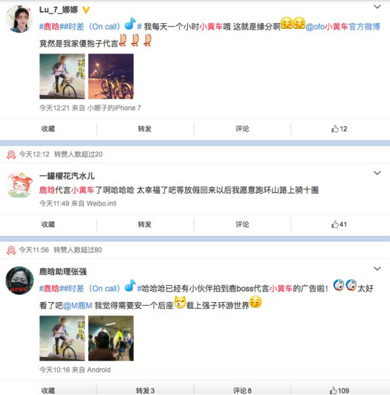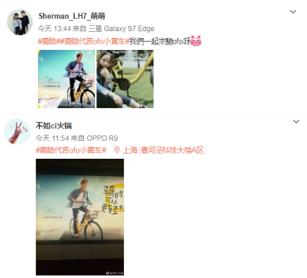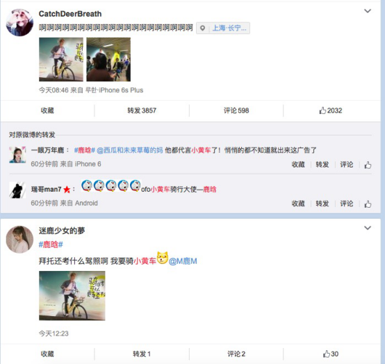不少鹿晗粉丝以及网友看到“ofo签约鹿晗”的广告之后也表示,“五一小长假,出行只骑小黄车。”