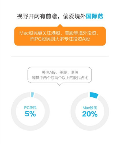 与超过95%的PC股民更钟爱A股不同,Mac股民投资相对更多元化,或者说更具有前瞻性和国际视野。Mac股民中高达20%的人群将投资目光放到了海外,会更关注港股、美股等境外投资。
