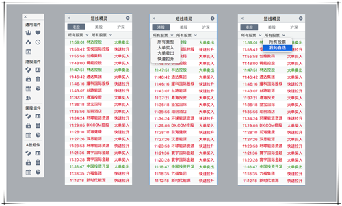 交易面板新增短线精灵组件,实时监察三大市场股票异动,同时可筛选异动类型、自选股异动;