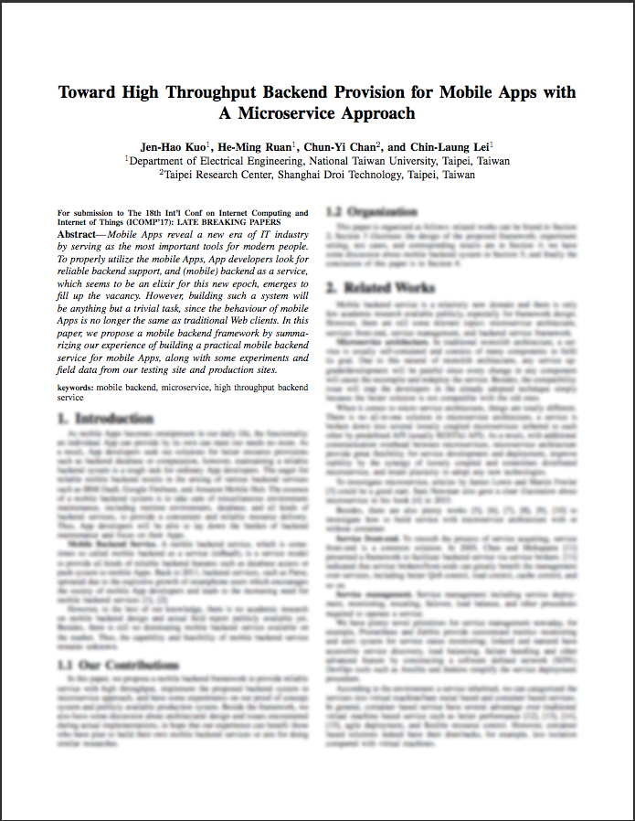 此次DroiBaaS投稿主题为『以微服务架构实现的高性能移动互联网云计算架构』(Toward High Throughput Backend Provision for Mobile Apps with a Microservice Approach) 。在提交的论文中,DroiBaaS团队主要分享了基于过去长期进行移动互联网服务开发的经验、所提出的DroiBaaS自主研发全栈式优化微服务架构,并基于这个服务框架一手打造的移动互联网服务框架。不仅如此, DroiBaaS团队还在产品发布后短短六个月内获得了数千款优质互联网应用及数千万活跃用户的青睐,之后也将进一步把此架构免费开放给广大移动互联网开发者及创业者使用。实践是验证理论的重要标尺,一如市场是验证产品的最好标准。据悉,『以微服务架构实现的高性能移动互联网云计算架构』论文,依据服务千万终端运行的真实数据为验证方式阐述说明,正是通过对后端服务的系统日志进行分析研究,取得了初步的研究成果后,才有了此篇论文中针对移动应用后端的设计与实际应用进行的深入讨论。