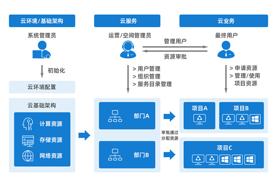 ·云平台管理层提供云计算的统一的运营和运维入口,以及友好易用的租户操作界面,遵从一致性的使用体验,用户可通过自助服务界面来申请和管理自己的资源。
