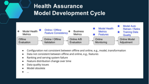 而Health Assurance Layer可以在整个开发周期中持续监控模型状态。比如,它确保用于模型训练的离线特征和用于在线推理的在线特征在统计意义上一致或近似,同时确保在线模型的良好性能。比如在预测分数的时候,工程师希望在线打的分与离线训练的分数精度一致。一旦Health Assurance Layer检测到异常,会自动提醒工程师,然后工程师可以介入,进行调试。Health Assurance Layer还提供了很多有用的工具,帮助工程师进一步确认问题所在。是代码出错?还是数据缺失?还是仅仅因为模型老旧,需要重新训练?