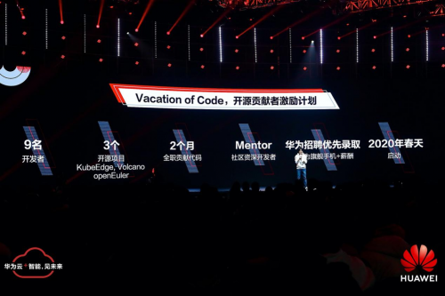 【姚天舒】作为一个开发者,我很荣幸将公布两个非常有趣的项目。第一个就是Vacation of Code开源贡献者激励计划。我们会征集9名开发者投入到3个开源项目中,包含KubeEdge、Volcano和openEuler,全职贡献代码2个月。参加此计划的开发者将获得多项奖励,还有优先入职华为的机会。
