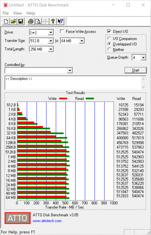 ATTO Disk Benchmark主要测试硬盘对不同大小文件的传输速度,其中红色条为写入速度,绿色条为读取速度,文件大小从512B-64MB依次向上增加。从测试结果可以看出,这块SSD在传输512KB至64MB大小文件的表现还是非常稳定的,读写速度均能保持在500MB/s以上。
