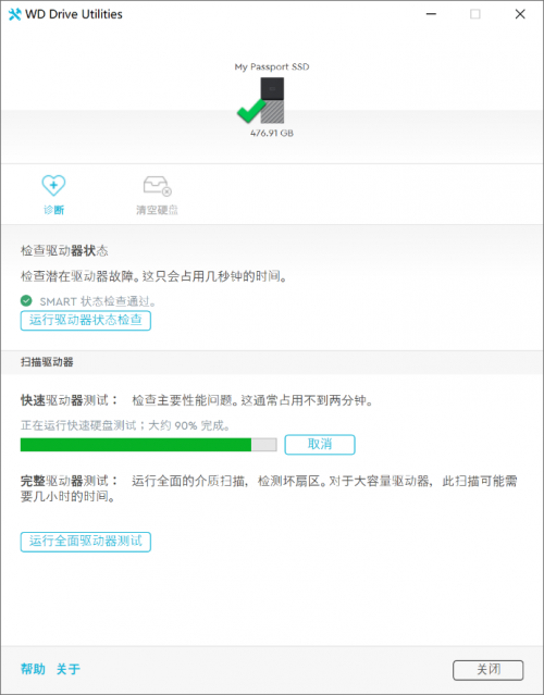 WD My Passport SSD还内置了多款软件,其中WD Driver Utilities可以用于硬盘的诊断与测试,包括硬盘状态检查、快速硬盘测试、完整硬盘测试,让硬盘随时工作在最佳状态,也可在需要的时候彻底清空硬盘数据。
