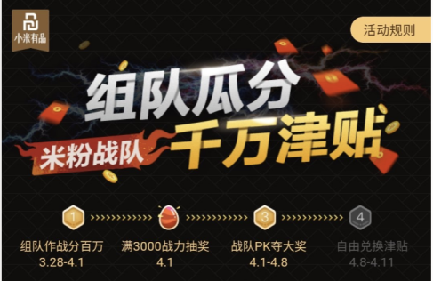 同时,小米有品还推出了米粉战队玩法,用户间自由组队,每个队伍2~5人,各战队可进行“战队PK”。活动结束后,冠亚季军的队伍每个成员可获得500元现金券;4-10名的队伍每个成员可获得200元现金券;11-20的名队伍每个成员可获得100元现金券。