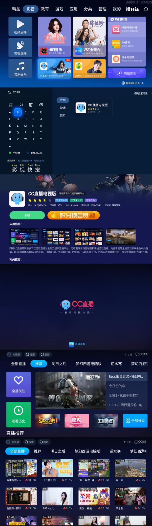 现在进入当贝市场影音分类,就可以看到网易CC直播TV版;或者直接在当贝市场搜索“CCZB”,就可以尽情享受大屏直播内容带来的无穷乐趣!