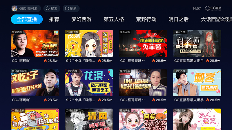截至2018年第三季度,CC直播签约主播60,000名,注册用户数超过2亿,月活跃用户超过2500万。背靠网易游戏高质量的用户群体,网易CC直播用户具有良好的黏度和消费潜力。精彩的CC直播不容错过,马上开启CC直播电视端体验吧!