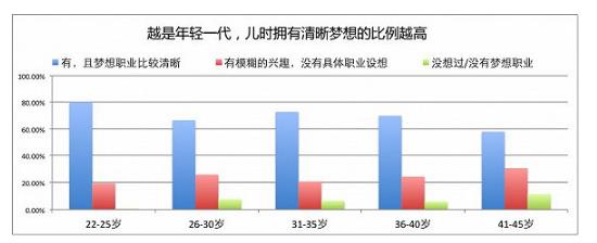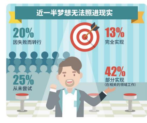 没有完全变成年少时希望的样子也并不要紧,出于各种现实原因,近一半人做着与曾经梦想职业完全不同的工作,只有13%从事了与梦想职业完全相同的工作,4成人留在了相关领域。但高达75%的人都为之付诸过努力,并且超过8成人都表示未来在条件允许的情况下仍然会去继续追求,而工作6至10年是转行去追逐梦想的黄金期。