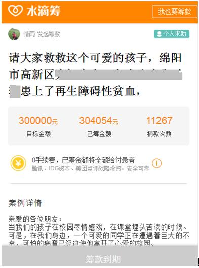 水滴筹0手续费救助八岁孩子 轻松筹得30万