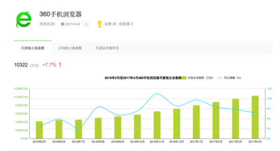360手机浏览器则是名副其实的后起之秀,起步最晚但攻势生猛,挤掉百度跻身行业前三,连续数月月度独立设备数环比增幅最大。4月月度独立设备数突破一亿,为手机浏览器亿级俱乐部新添一员猛将。