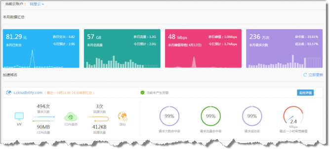 记者获悉,CDN加速域名导入成功后,行云管家对CDN加速域名的监控,提供了按天查看请求次数、访问流量、HttpCode(请求返回码)三个维度的监控。 行云管家将获取其最近31天的监控运行数据,待监控数据获取完成后,将会展示当前所有加速域名的数据汇总。数据汇总包含有支出成本、访问流量、带宽峰值、请求次数等重要的CDN运行指标,用户可通过这一系列的运行数据,了解CDN服务的运行状况。每个维度下面,分别展示了对应维度的数据。同时,也提供了对应维度的预警通知设置。