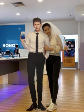 没能见到朱正廷本人,那就身披婚纱,与他的人形立牌合照吧。甜蜜的珍珠糖们,就是有融化人心的魅力。