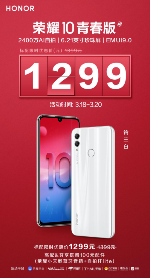 想要获得朱正廷同款的荣耀10青春版铃兰白手机吗?那就赶快登陆VMALL商城、天猫、京东等电商平台购买吧!即日起至3月20日,vmall商城周年庆优惠活动火爆开抢!购买标准版本,1299元就能到手!高配版本和尊享版本还可获得价值100元精美配件,购机还可以赢取朱正廷签名版手机哦!
