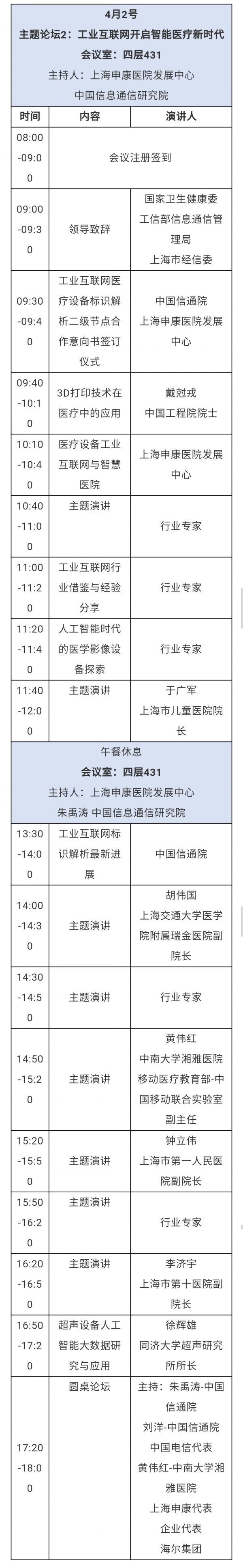在4月2日举行的“工业互联网开启智能医疗新时代”主题论坛将汇聚生物医药工业互联网领域的重量级嘉宾与最新成果。论坛拟邀请来自国家卫健委、工信部、上海申康中心的多位领导深度解析政策方向与发展趋势,邀请工业互联网领域的众多一线专家分享工业互联网应用在医疗设备管理、智慧医院建设、生物医药3D打印、AI辅助药物研发等方面的技术与经验,并讲解工业互联网标识解析等进展的最新动态。此外,来自相关企业的各位代表也将为我们带来丰富的案例分享与应用示范。