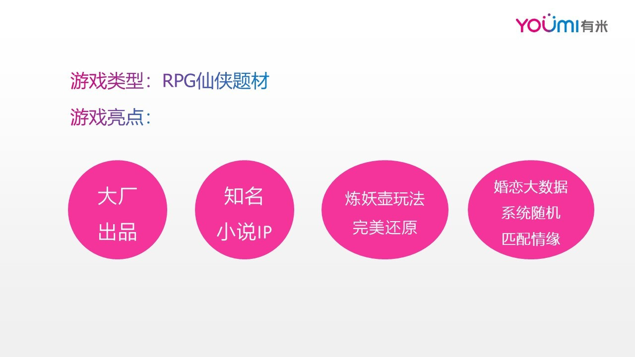 以有米科技游戏优化组近期投放的某大厂游戏为例,分享仙剑题材游戏如何投放更出量。首先,需要对该仙侠题材游戏有深度的了解。通过对游戏的分析提取游戏的亮点如下: