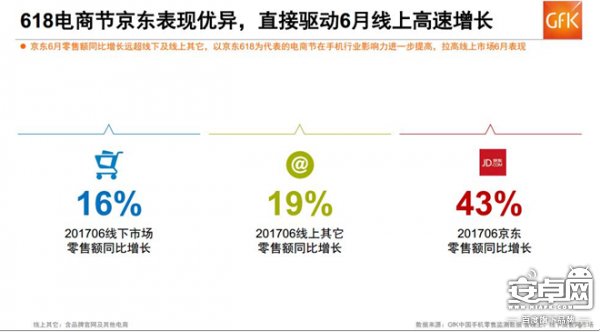 618电商节的再度火爆,也是助推京东手机大卖的一大因素。根据京东手机的618“终极战报”。手机成为2017年京东618最大的功臣,活动期间手机销售额同比增长超过60%,从而推动了6月整体手机零售额增长达到43%,遥遥领先线下市场和线上其他平台。