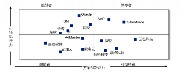 其中,数字营销解决方案提供商中属于领导者的厂商在市场竞争占据了绝对优势地位,但目前厂商较少,以SAP、Salesforce为代表。属于挑战者阵营的厂商虽占有较高的市场占有率,但欠缺前瞻性,产品发展创新性也有待加强,因此以传统CRM、ERP、数据库厂商为主。可期待者虽然由于发展历史或业务定位问题在市场地位上暂时落后,但他们拥有某项特殊的优势或资源,因此在市场的某些领域会有很强的竞争能力,这其中以云徙科技、端点科技为代表。
