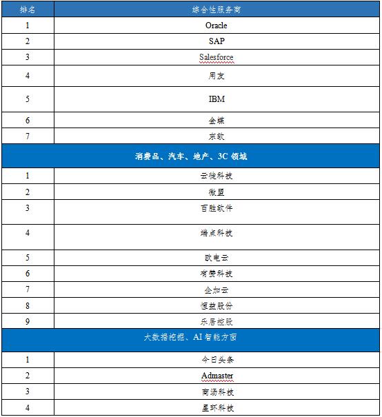 目前,市场上主要数字营销解决方案提供商大致可以分为以SAP、Oracle等为代表的传统厂商阵营和以阿里云、腾讯云、云徙科技、端点科技等为代表的新生态厂商阵营。