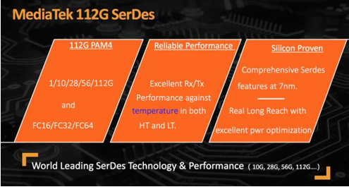 在沟通会中,MediaTek副总经理徐敬全介绍了最新的硅认证7nm工艺的112G远程SerDes技术,该技术在今后将会应用在ASIC(定制化)芯片中,采用了PAM4 高速传输信号,具有一流的性能、功耗以及工艺,与上一代的56G速率SerDes技术相比整整提升了1倍的速率。可以为企业级与超大规模数据中心、超高性能网络交换机、路由器、4G/5G基础设施、AI及深度学习应用、需要超高频宽和长距互联的新型计算应用提供技术支持。
