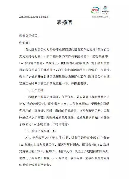 新年到来之际,科箭收到了来自伊利奶粉事业部物流管理部的一封感谢信。除了感谢科箭“一直以来对伊利奶粉事业部信息化建设工作的支持与帮助”,科箭人对工作的认真负责和团队精神,也深深地感动了伊利。