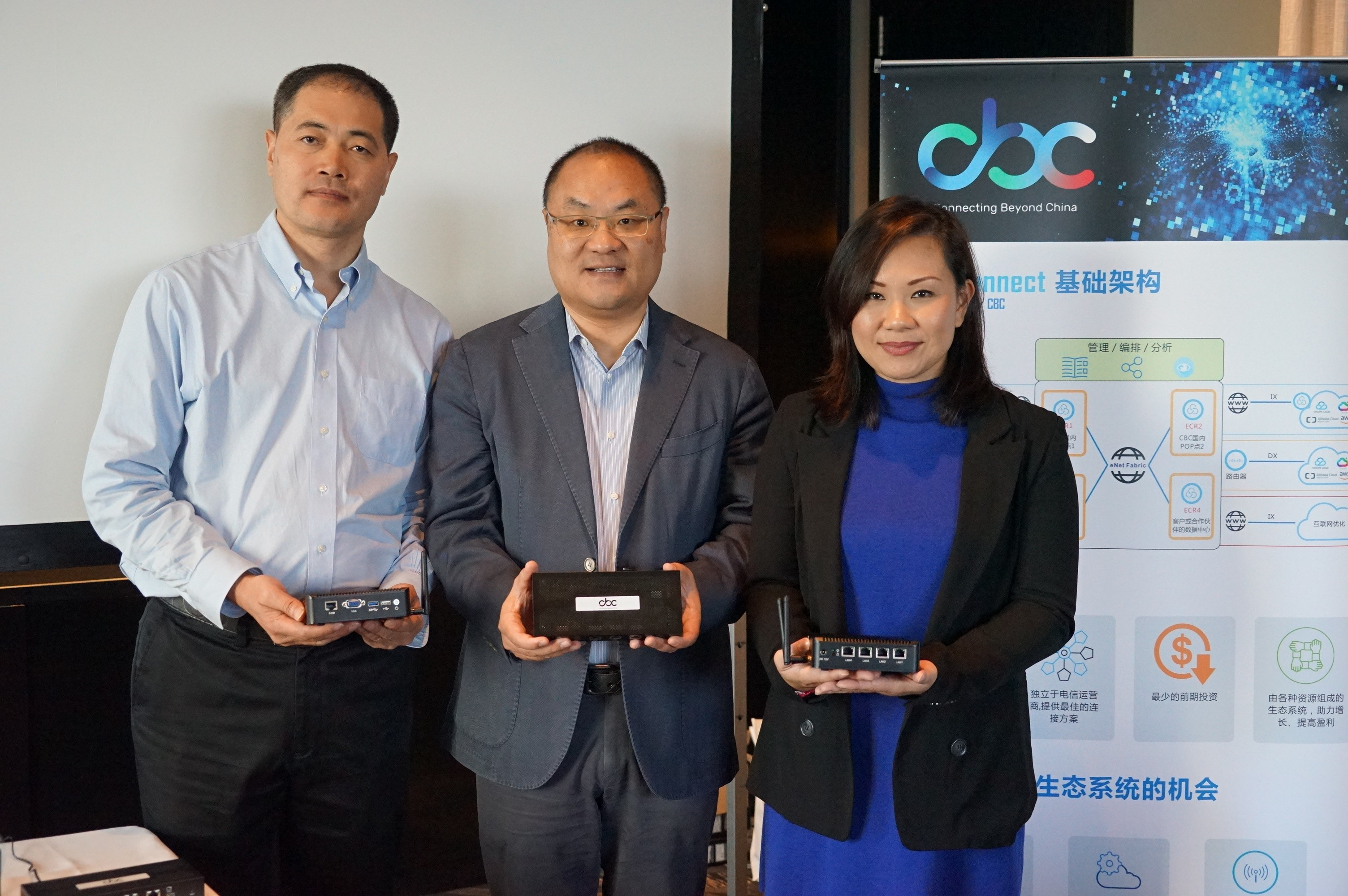 (CBC联合创始人、董事长韦轶群先生(中),CBC副总裁兼CTO宋长友先生(左)及CBC副总裁兼首席客户官邱淑明女士(右)共同启动CBC eNet Connect发布)
