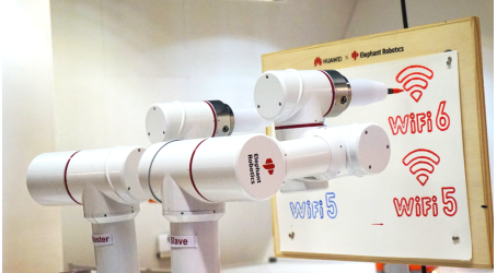 两台Elephant Robotics®P3机器人,一台为主,一台为辅,双臂联动,生动展现HUAWEI WiFi6技术较传统WiFi5技术的优异特点。在WiFi5及HUAWEI WiFi6两种通讯模式下,辅机器人分别模仿主机器人进行图像绘制。较之WiFi5模式下,HUAWEI WiFi6模式下的机器人滞后性更短,模仿速度更敏捷,协同作业性更强。