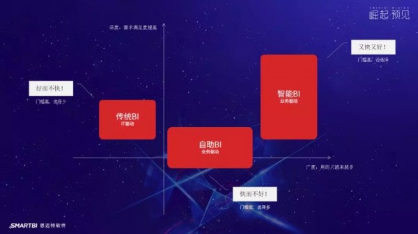 根据第三方数据,国内BI市场规模近年和未来都保持30%的高速增长,2020年可达到百亿规模。作为“有历史故事”的思迈特软件,凭借扎实的行业积累和研发技术,顺势而为打造“Smartbi“品牌,以“更聪明的大数据分析软件,快速挖掘企业数据价值”为使命,不断超越和创新,近几年来获得了70%的复合增长率,成功跑赢了“大盘”。但从国际、国内咨询师分析来看,BI还远远没有满足企业客户的需求,这点也可以从该领域内不断出现的新技术、新产品、新概念得到印证。按业界的习惯,如果一个细分行业充分成熟,就会被成为“后XXX时代”,比如后ERP时代。但BI被注入大数据技术,以及人工智能技术后,却迸发了更强的生命力,让企业用户和独立厂商围绕“智能”产生了无限遐想与探索。最近常常看到的概念就是传统BI、自助BI和智能BI。表面上看这是个发展路径,传统BI将会被自助BI取代,而未来智能BI也会取代自助BI。如果这么理解的话,估计您会付出一些走弯路的代价!