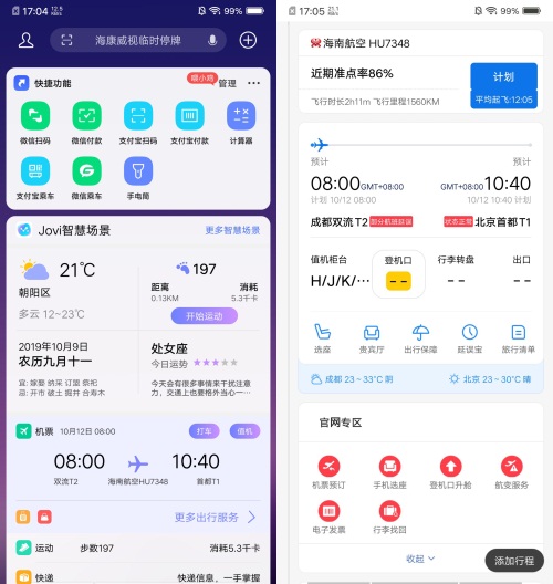 为了提升旅客出行体验,探索无限服务场景,颠覆传统航空服务,航班管家与海南航空打破目前航司服务体系布局不完善的现状,首次共同将便捷快速的手机负一屏作为全新航司服务载体,创新用户出行体验,在负一屏中为用户提供官方的机票预订、手机选座、登机口升舱、航班动态、航变服务、行李找回、电子发票等全面的旅客服务,更全面、精准的为旅客提供多元化服务体验的同时,也能大大提高航司服务效率。