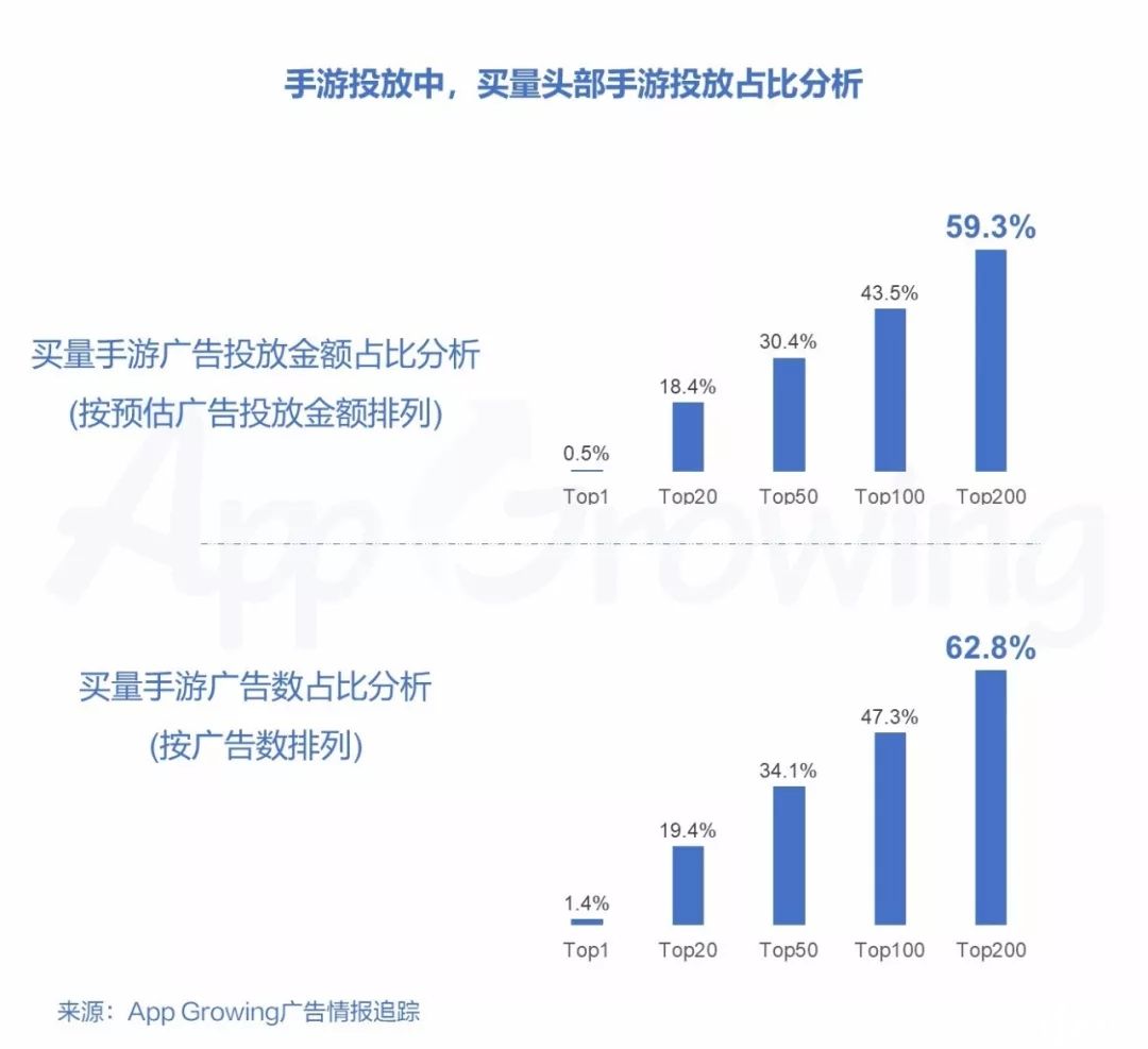 在整体手游广告投放中,预估广告投放金额Top20的投放金额占整体手游广告投放的18.4%,而Top200的广告投放金额则占比59.3%;广告投放数Top20的广告数占整体手游广告投放数的19.4%,而Top200的广告数则占比62.8%;
