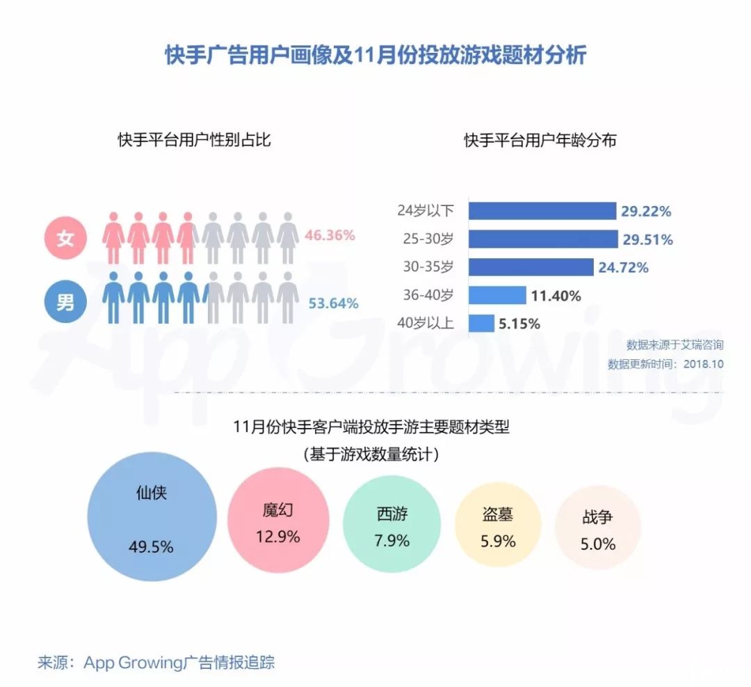 对快手短视频平台进行用户画像分析,男女比例较为均衡,年轻用户占比高,30岁以下的用户占比58.7%。在游戏题材方面,有49.5%的手游为仙侠游戏,占比最高,其次为魔幻类游戏,占比12.9%。