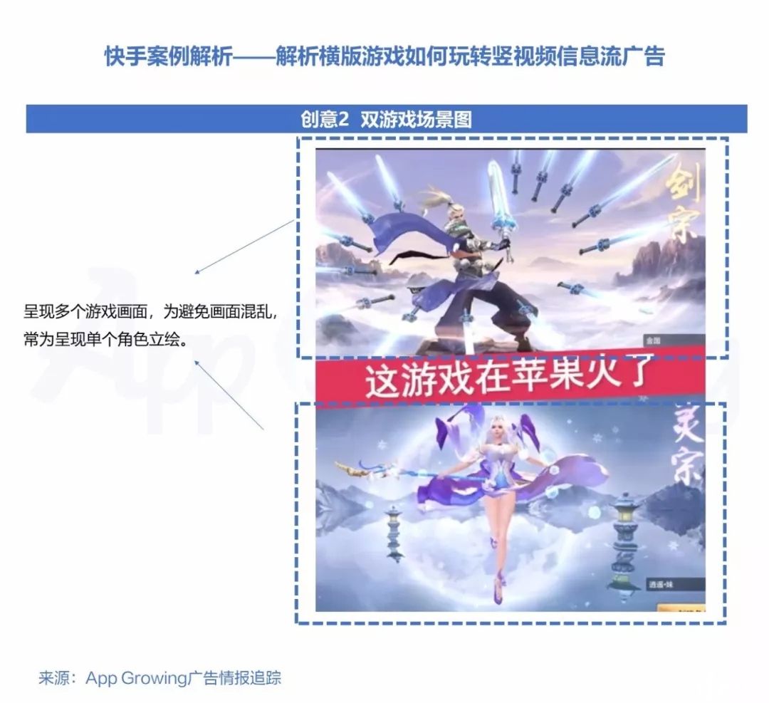 快手广告平台的信息流视频广告以竖视频形式为主,竖视频视觉效果相对更好,原生度更高,更易引起用户注意。横版游戏由于画面比例问题,无法单纯地以竖视频方式呈现,其常用以下五个投放创意套路投放竖视频广告。(以下为短视频截图)